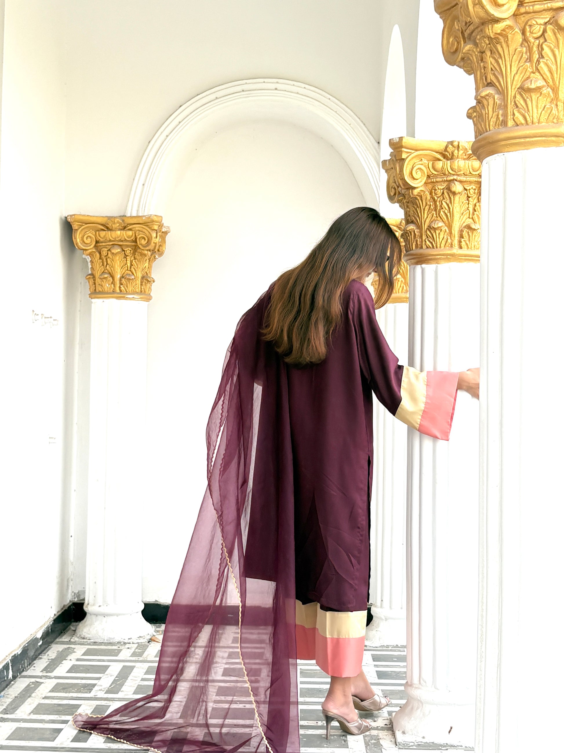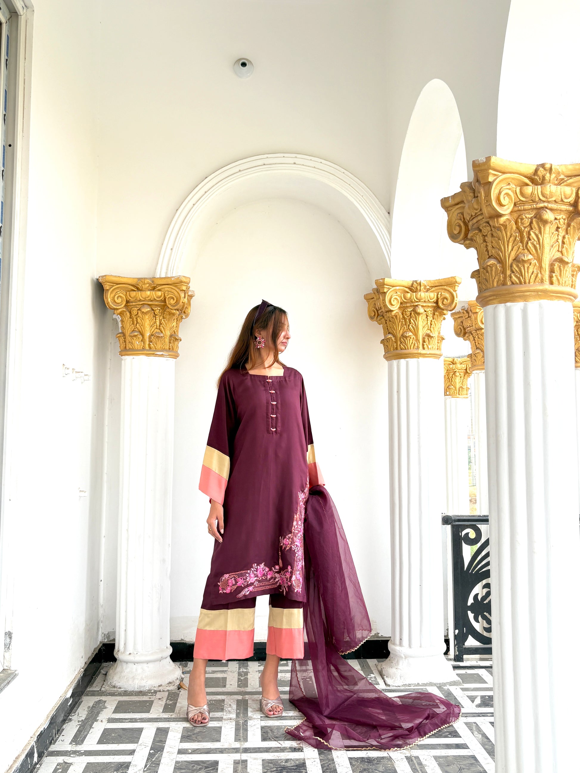 Step into timeless elegance with our Royal Plum Bloom, a sophisticated three-piece ensemble crafted to elevate your festive and formal look.