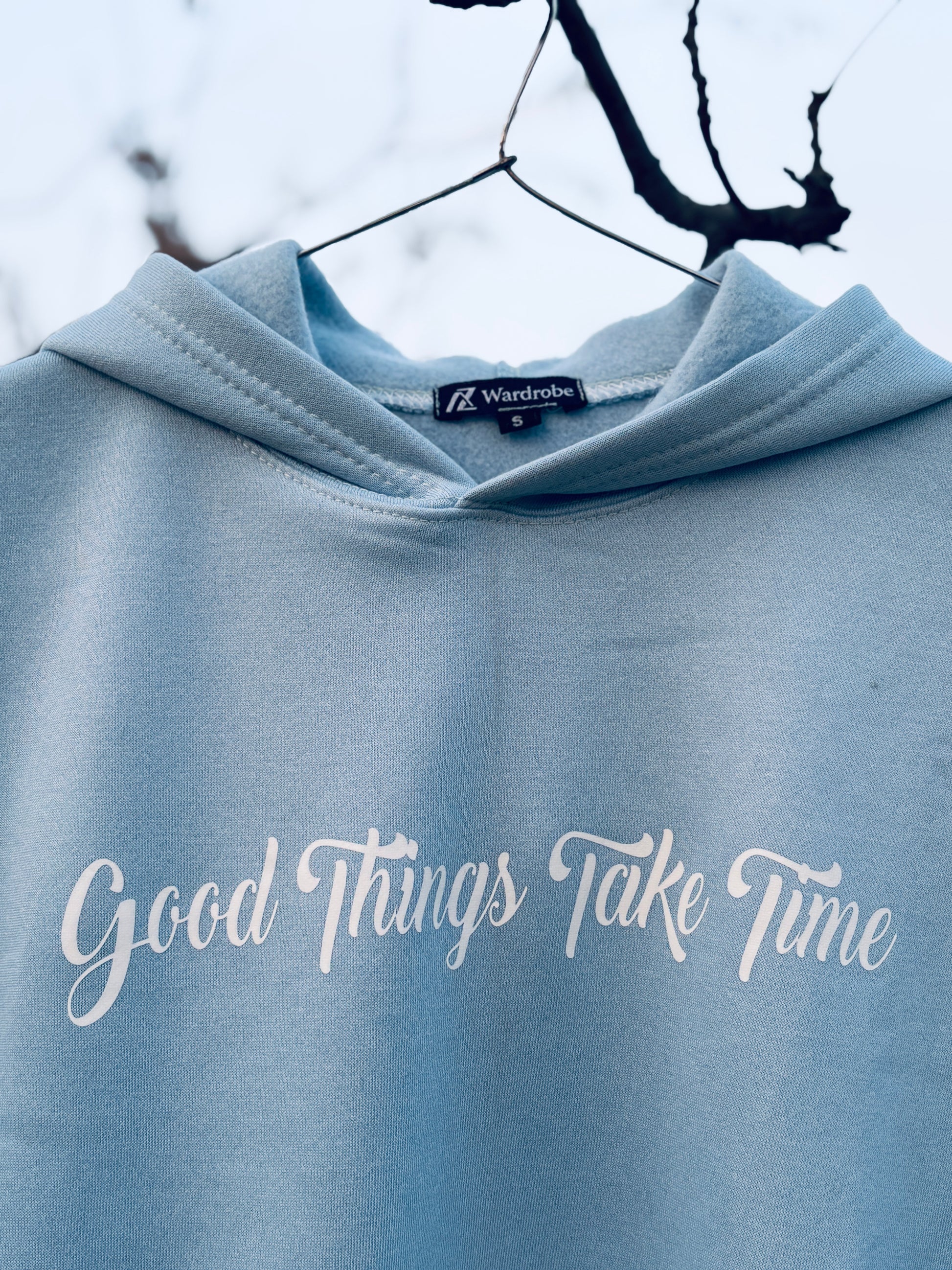 "Elevate your style with our 'Good Things Take Time' hoodie, featuring a soothing light blue hue and elegant white script. Crafted for comfort, this hoodie boasts a spacious kangaroo pocket and relaxed fit. Perfect for casual wear, it's a thoughtful addition to any wardrobe, promoting patience and positivity in a cozy, laid-back design."