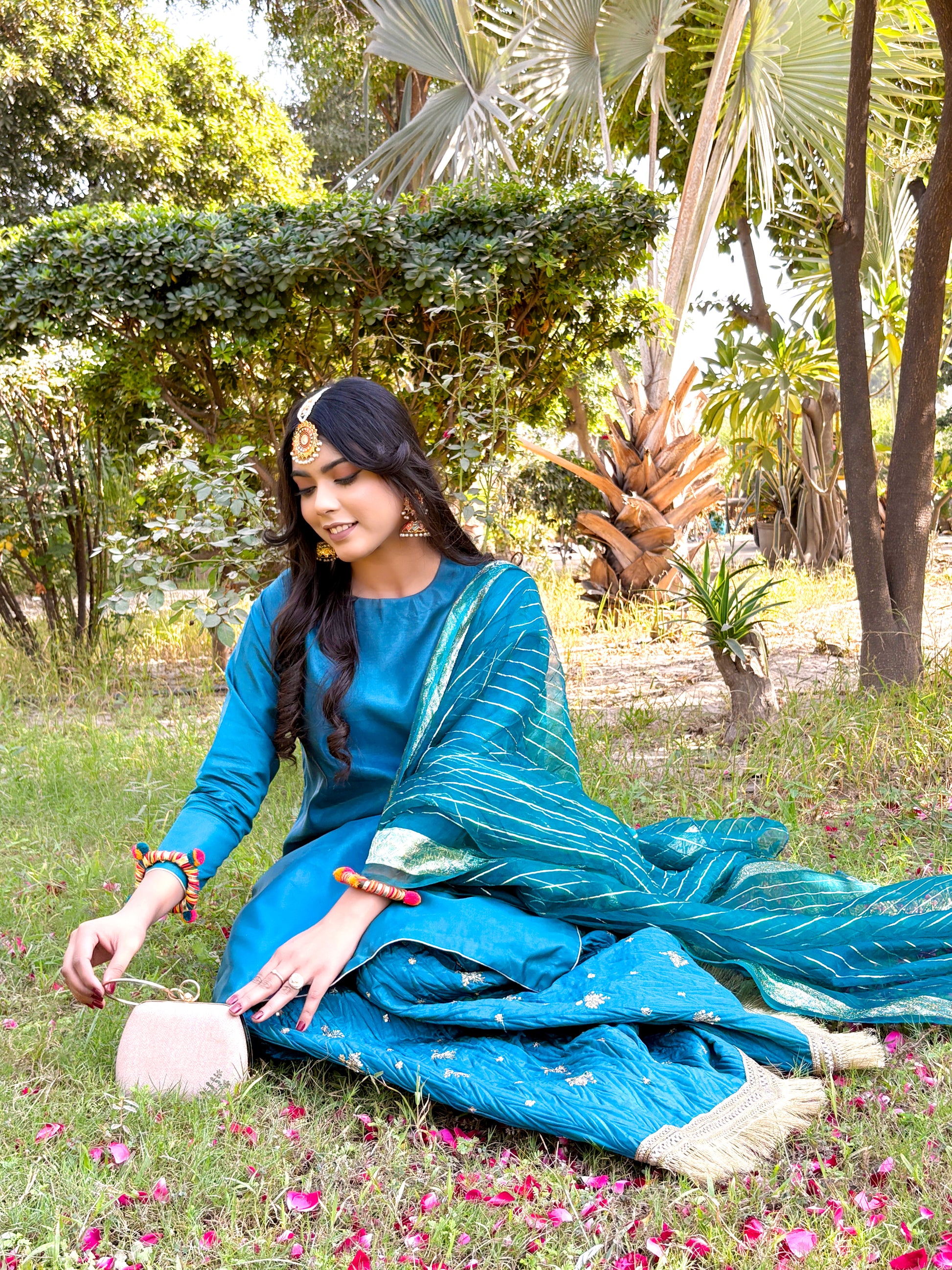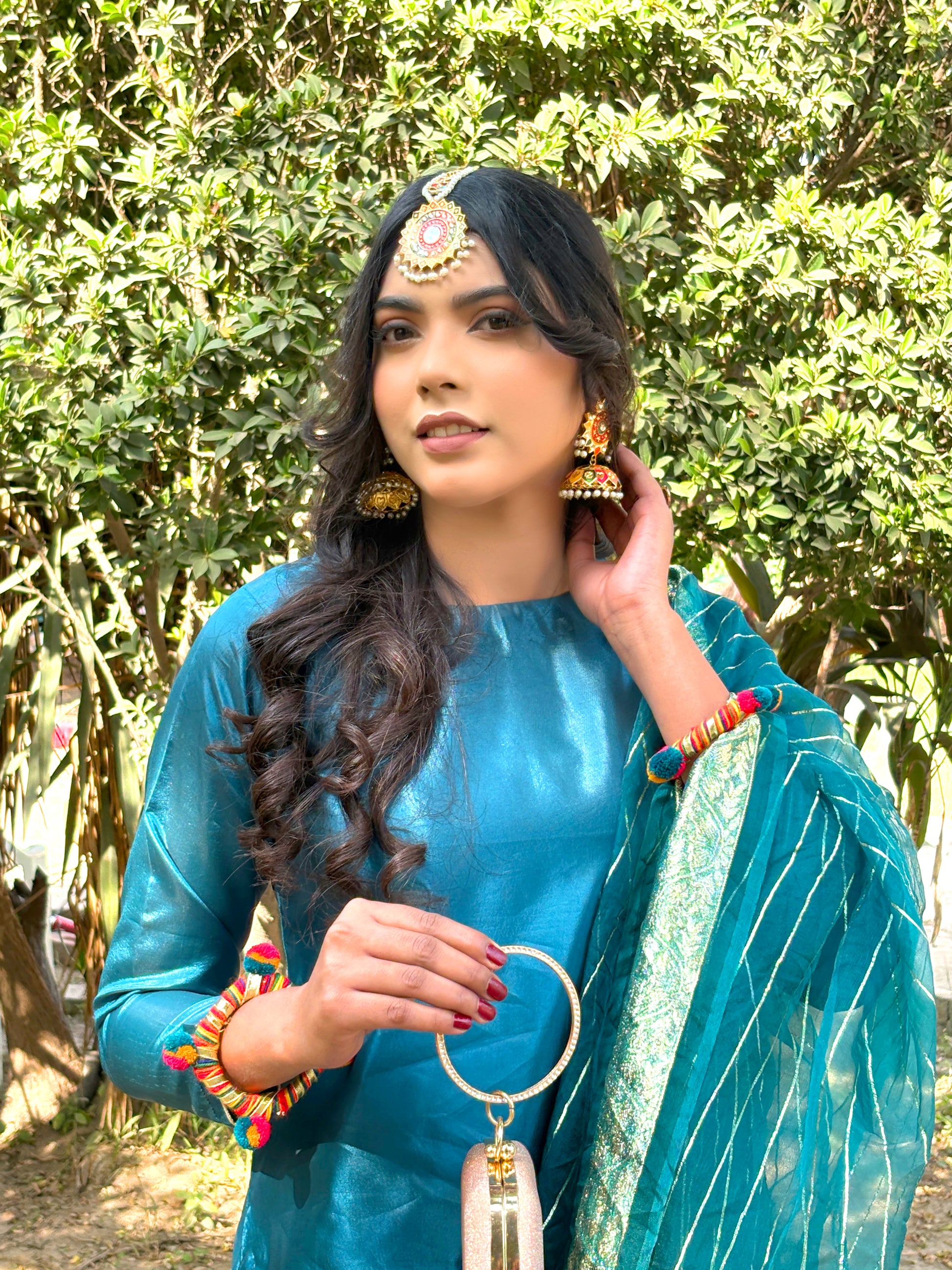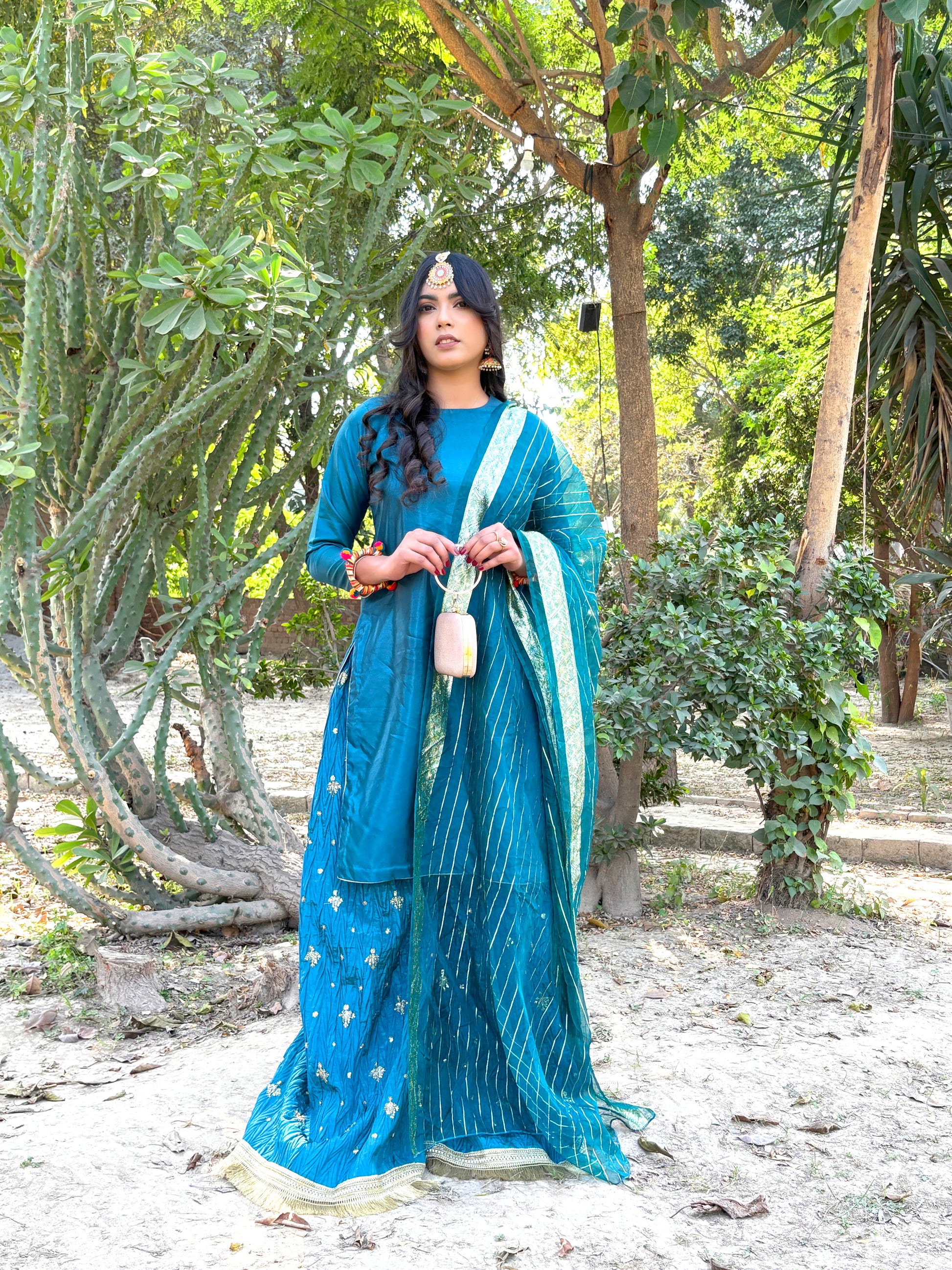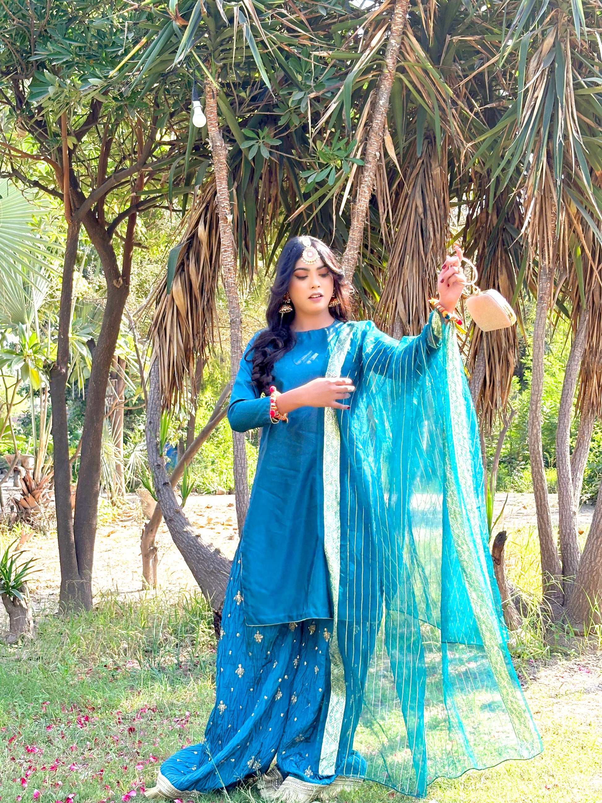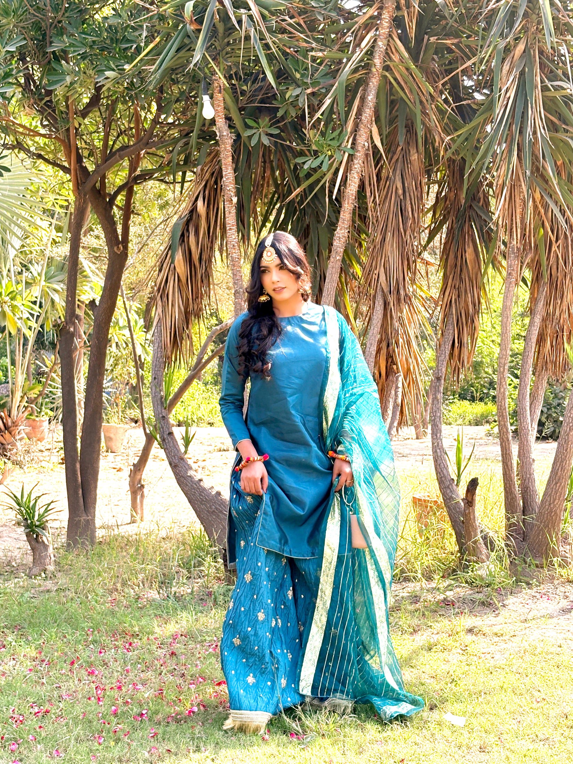 Introducing our stunning 3-piece Teal Blue silk suit, designed to elevate your beauty and style. This stitched suit is the perfect blend of superior comfort and a stylish look, featuring a simple silk shirt, a beautiful crushed silk sharara, and a matching sheer dupatta.